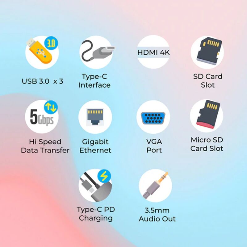 Type C port to USB 3.0 x 3, USB 2.0, SD/Micro SD, HDMI/VGA,